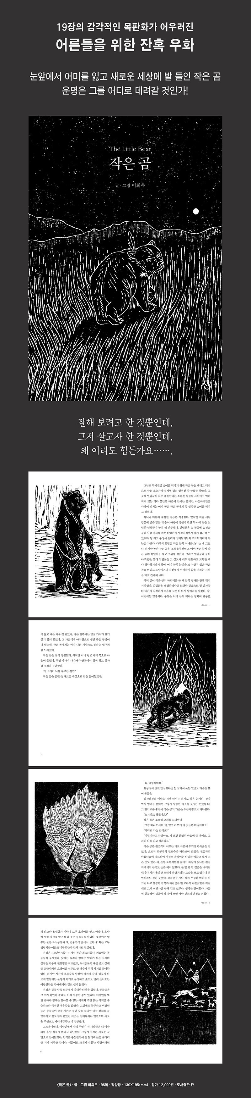 목판화로 제작한 19장의 삽화가 어우러진 《작은 곰》은 잔혹하고 어둡다. 풍자나 해학을 통해 교훈을 주고자 하는 보통 우화와 다르게 《작은 곰》은 100쪽이 채 안 되는 짧은 분량만으로도 마지막 페이지를 덮을 때면 진이 빠질 만큼 인간 군상에 냉소적이다. 밀렵꾼의 총알에 어미를 잃고 두려움에 떨던 작은 곰이 자신을 부르는 듯한 휘파람 소리에 이끌려 숲속에 발들이면서 이야기가 시작된다. 숲에 깊이 들어갈수록 다양한 동물을 만나며 조금씩 성장하는 냉혹한 여정이 펼쳐지는데, 작은 곰이 맞닥뜨린 숲과 동물들의 모습이 지금 이 시대와 인간 군상의 병폐를 적나라하게 보여 준다.