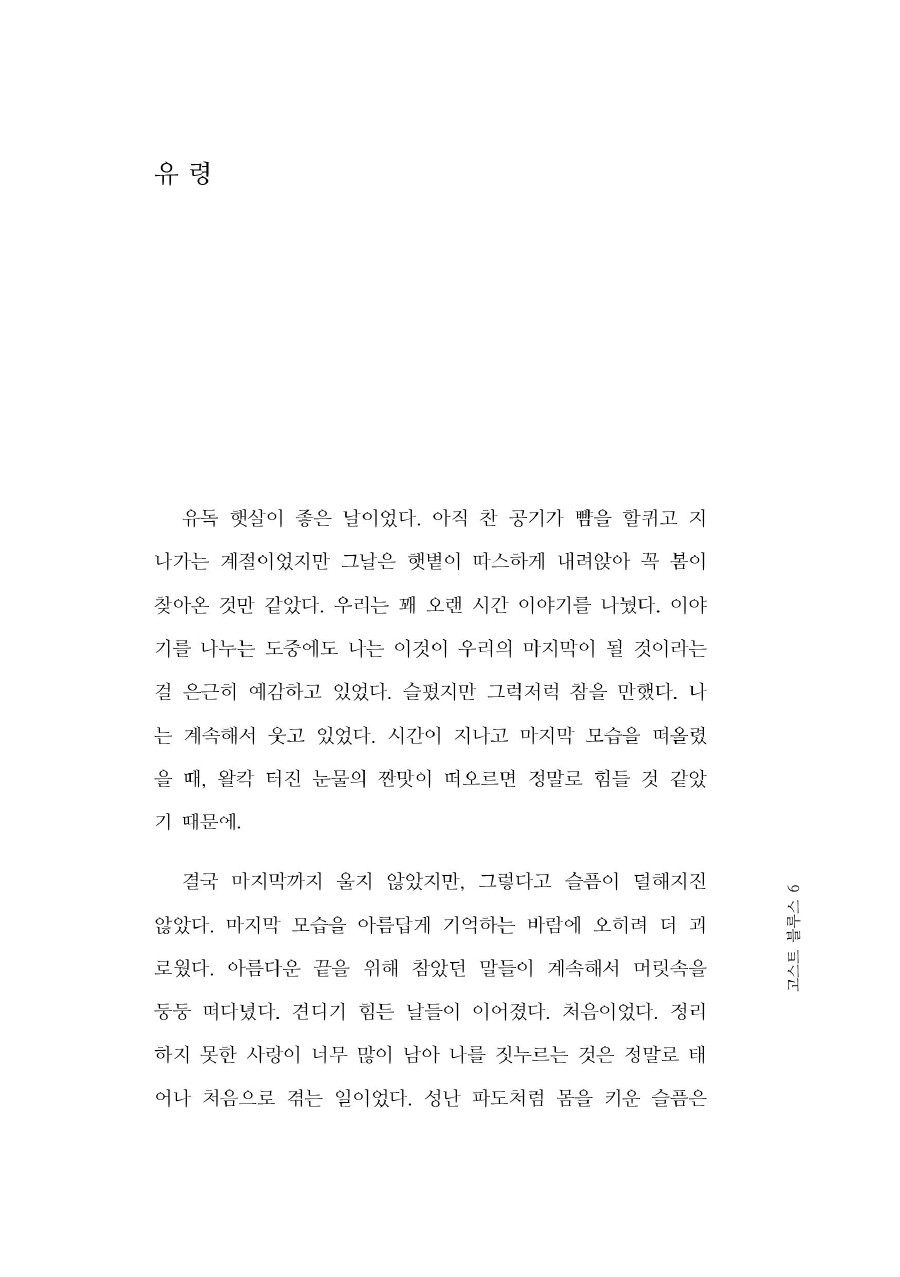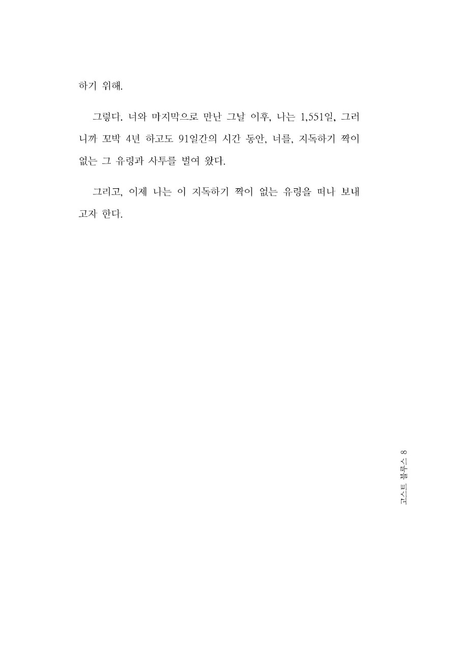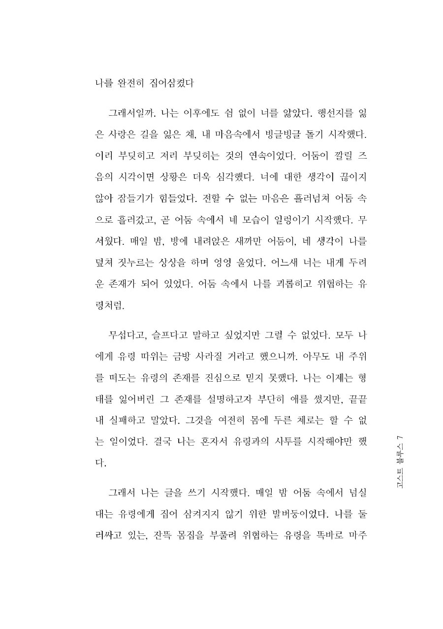 이별 그 이후, 1551일간 ‘나’를 따라 다녔던 유령을 마주하며 써내려간 글들을 묶은 산문집 입니다. 또한 중간중간 글을 새롭게 해석하여 그린 10장의 일러스트도 엽서의 형식으로 함께 삽입되어 있습니다.