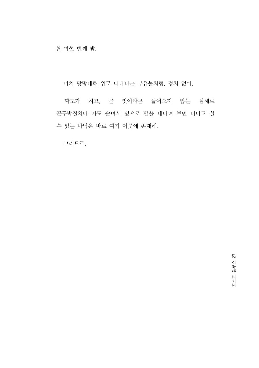 2014년의 겨울, 가장 아름답고 절실했던 사랑이 끝나고, 저는 유령을 보기 시작했습니다. 오랫동안 저는 그것의 정체에 대해 의심하며 짧은 글을 기록하곤 했습니다. 그리고 1551일 이라는 시간이 흘러 마침내 그것이 유령이라는 것을 깨닫고, 이제는 그 ‘유령’을 바라본 기록을 세상에 공개함으로써 그를 제 곁에서 떠나보내고자 합니다.