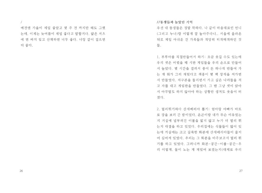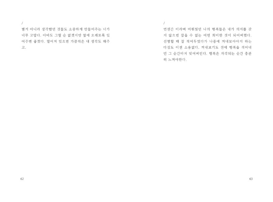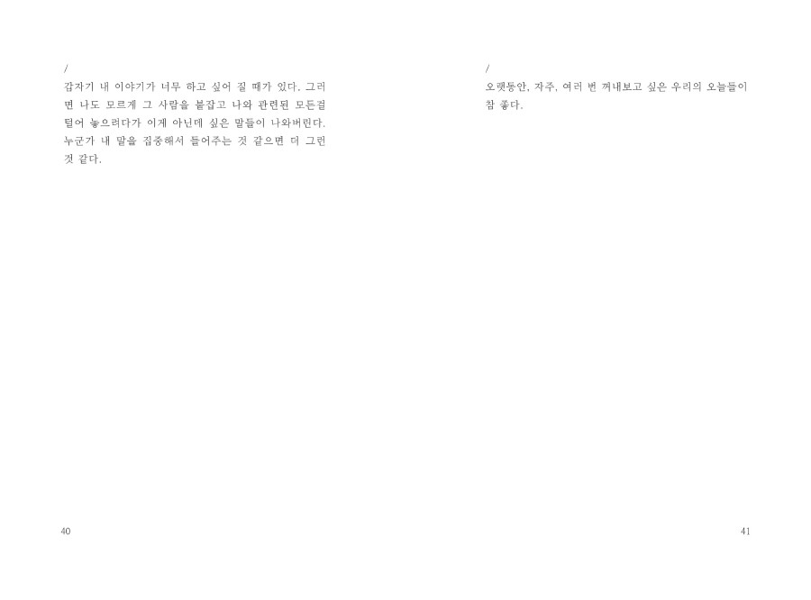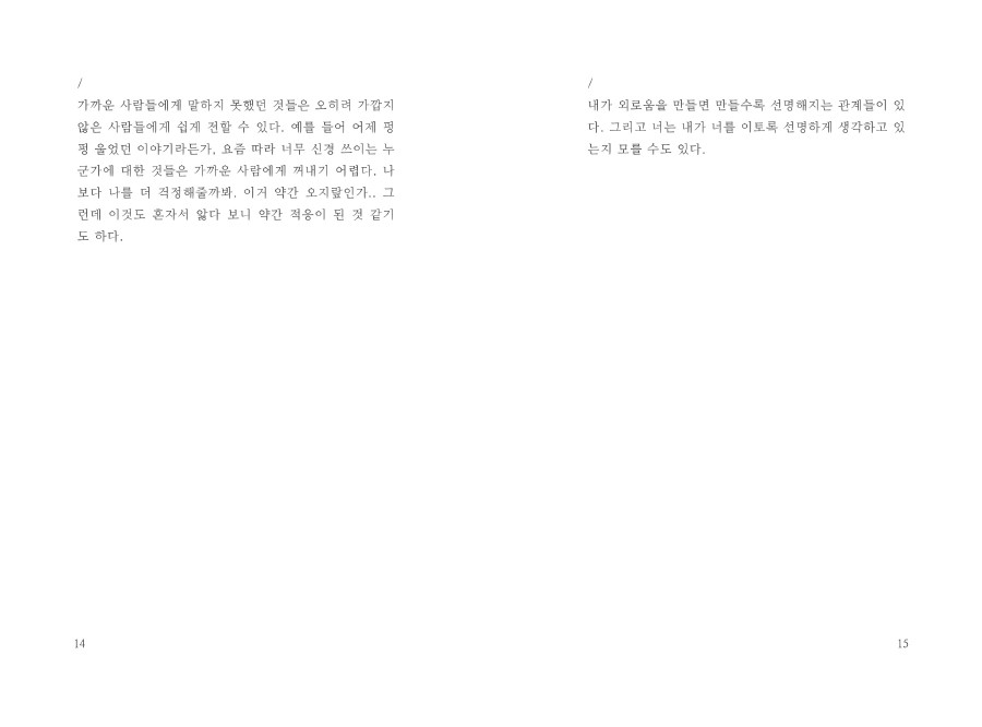 단순히 웃음이 나오는 순간부터 누군가에게 말할 수 없는 마음을 가지게 된 순간까지, 내가 만나는 순간들에서 느꼈던 그대로를 짧게 기록했다.