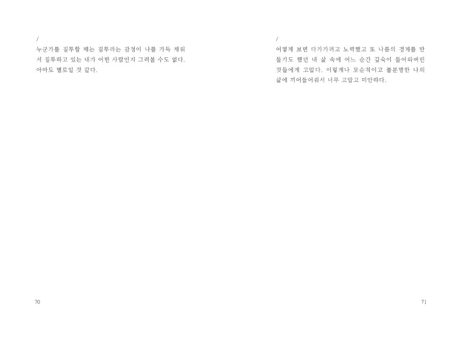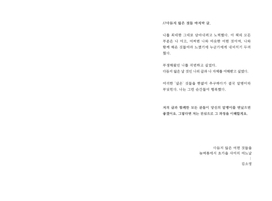 이 책을 통해 내가 가진 모습 그대로를 드러내고 싶었고 나와 같은 마음을 가지고 있는 누군가가 위로를 받거나 혹은 안심이 되기를 바랐다.