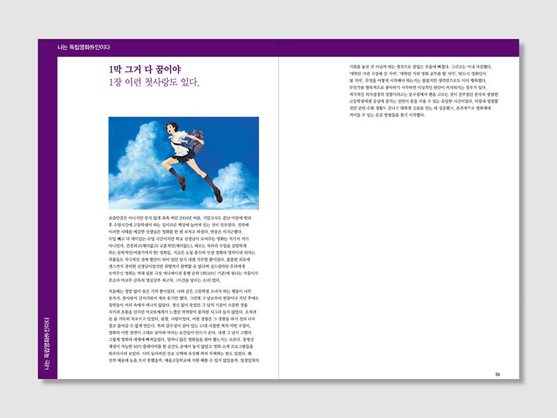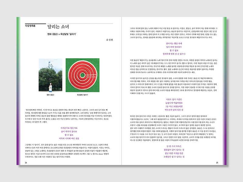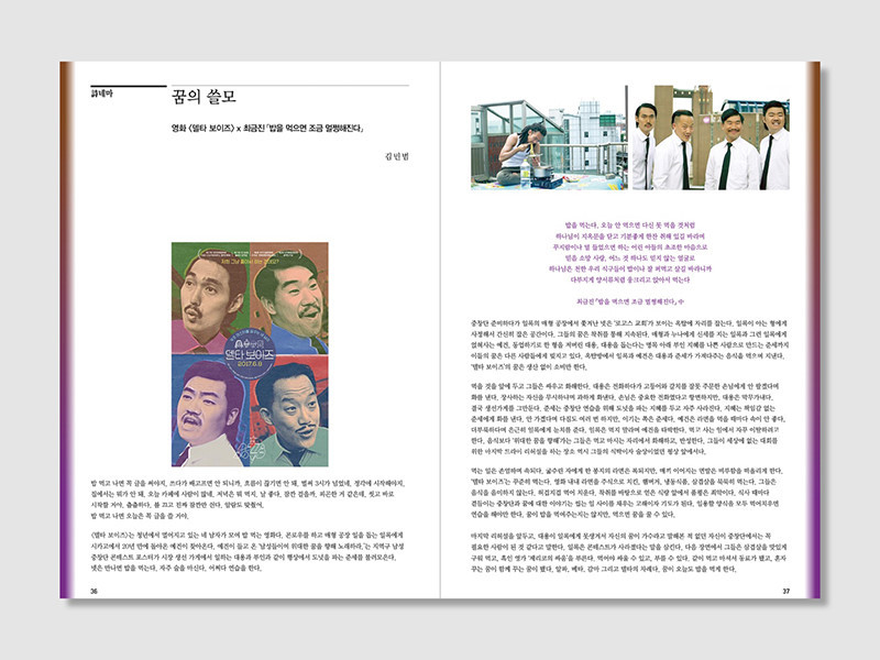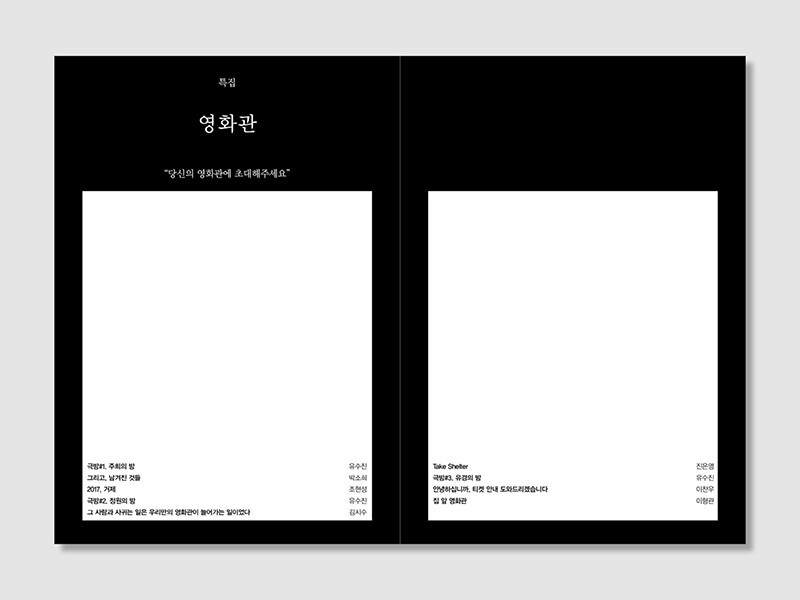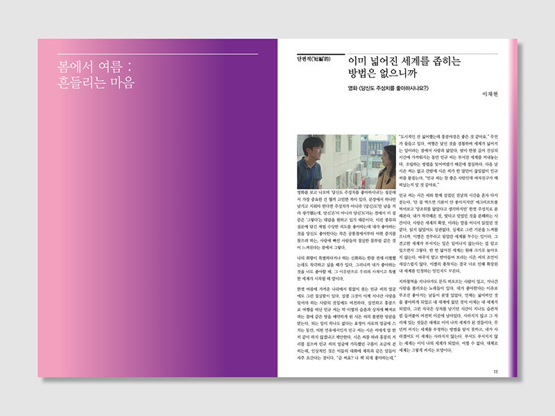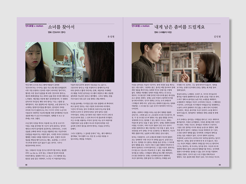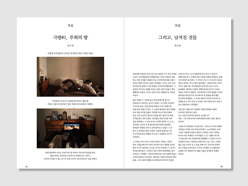 내부에서는 각자의 장기를 독립영화와 결부시킨 코너를 새로 선보였습니다. 독립영화 속 시적인 순간을 발견하는 김민범 님의 <時네마>와 영알못을 자처하는 일러스트레이터의 강렬한 영화 감상화인 조현진(HNJN) 님의 <3등 관객석>이 그러합니다. 단지 내부에서의 변화에 그치지 않고, 이번 3호에서는 ‘제23회 인디포럼’에서의 기록 및 외부 원고 모집으로 기획된 ‘영화관’ 특집과 같은 다른 방향으로의 고민도 녹아있습니다.