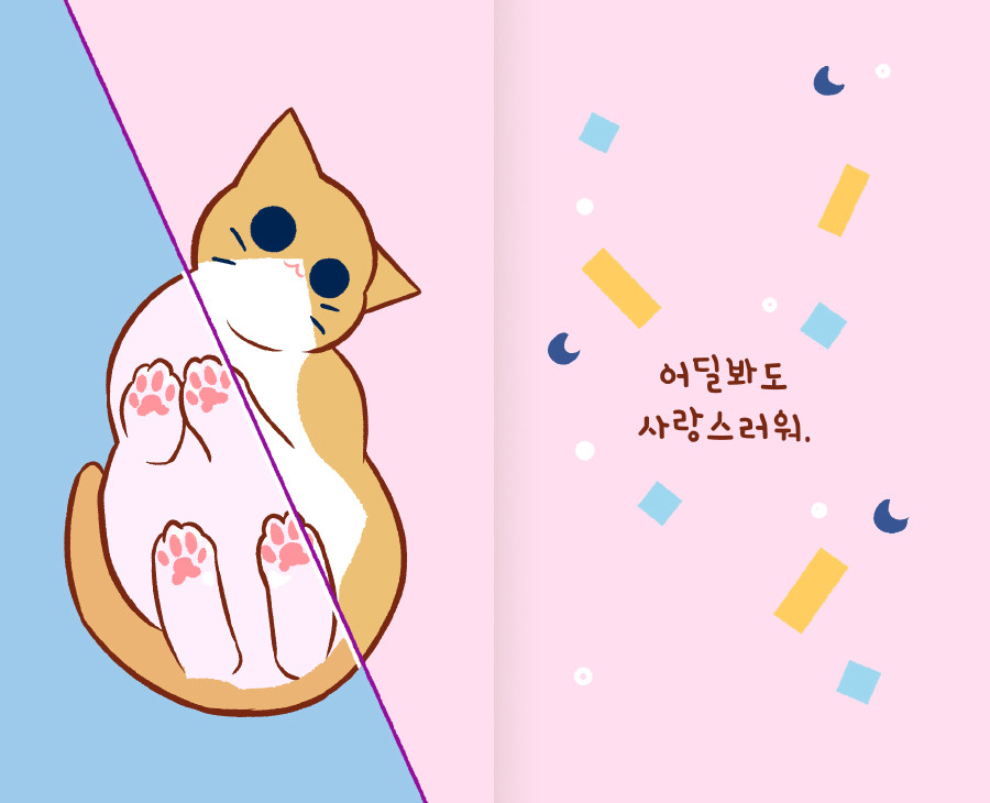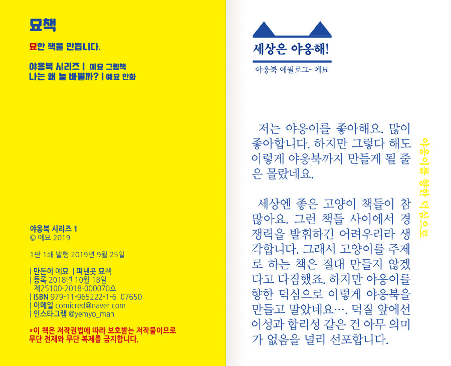 * 각권의 페이지가 얇아 중철 제본(호치키스 제본)을 진행하려 했지만 우리 야옹 씨들의 소중한 찹쌀떡이 호치키스심에 아야 할 우려가 있어 비싼 실제본 형식을 선택했습니다. (야옹안전제일주의)