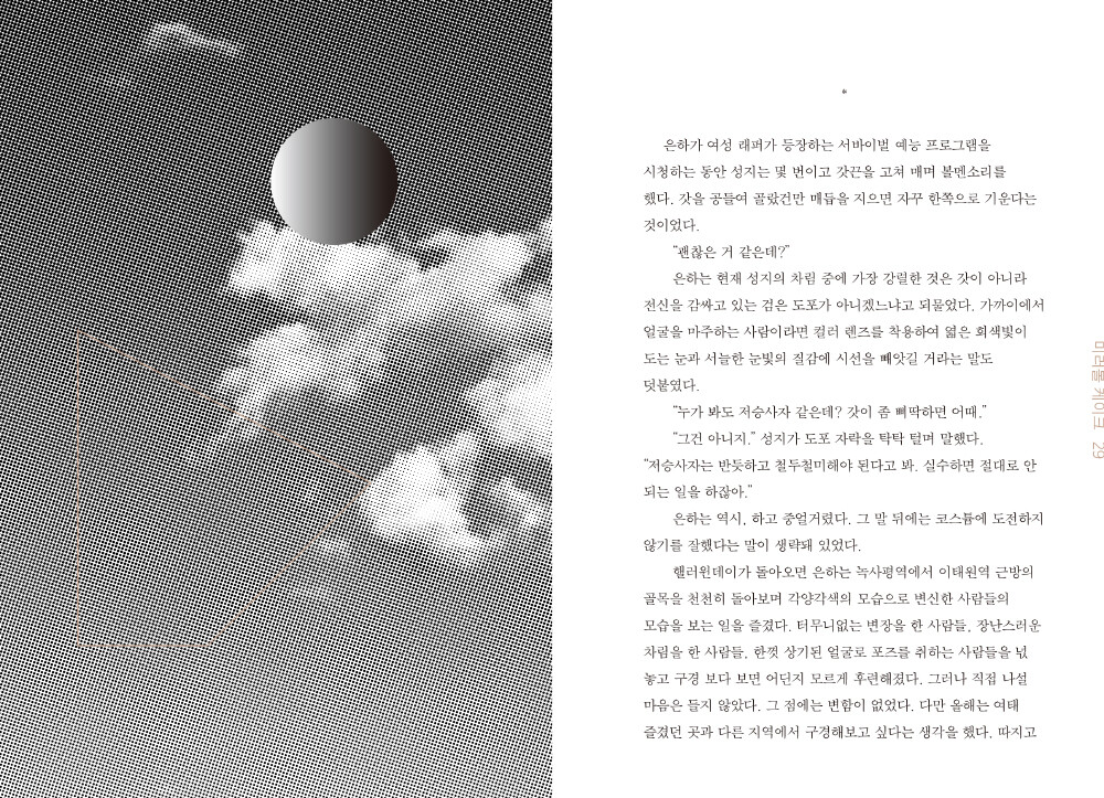 책을 펼친다. 언제나 책이 도와준다. 흰 눈이 쌓인 철길로 데려가 주거나 왁자지껄한 핼러윈 거리로 떠나게 해준다. 때로는 알 수 없는 시공간으로.