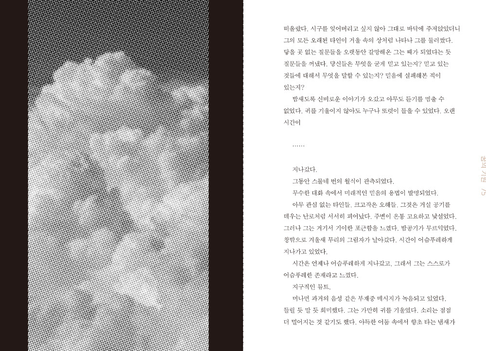 꿈에서는 누구나 혼자일 수밖에 없었다. 밤은 어김없이 찾아왔고 추위는 날마다 점점 더 깊어졌다. 멍하니 줄지어 서서 몸을 떨었다.우리는 한 편의 단편소설처럼 각자의 플롯 속에서 조용히 나아갔다. 손에는 오래된 지도 한 장이 쥐어져 있었다. 무수히 펼쳐진 밤들 중 하나로 저마다 조금씩 가까워지고 있었다. 익숙한 궤도를 돌고 돌아서 차원의 중심을 향하여. 그러는 동안 차마 버리지 못한 감정들이 제자리를 찾아갔다. 먼 곳의 별들이 거세게 타올랐다. 우리는 꿈속에서 끝없는 어둠을 더듬거렸다. 아무것도 보이지 않았지만 아무도 갈팡질팡하지 않았다. 신에게 기도하듯이 자기 자신의 어깨를 끌어안았다.