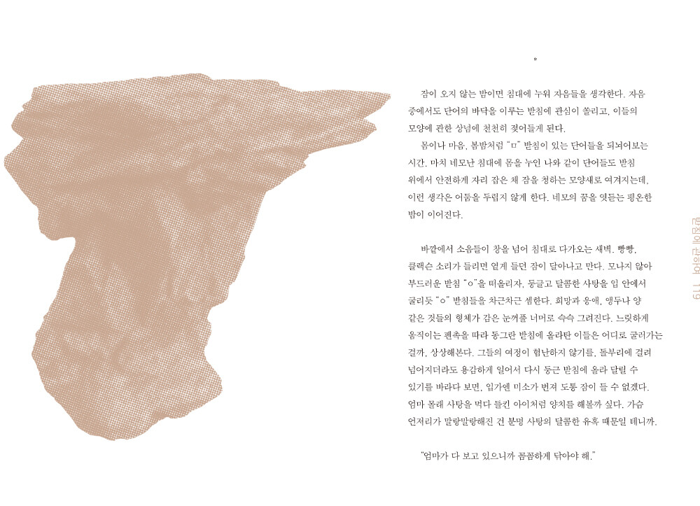 놀란 토끼 눈으로 욕실 밖을 내다보면 엄마는 없었다. 치, 거짓말쟁이. 분명 부엌에서 설거지하고 있겠지. 그렇다. 엄마의 공간, 부엌의 “ᄏ” 받침은 아련한 구석이 있다. 해 질 녘의 “ᄏ”은 또 어떻고. 연필로 이런 단어들을 써내려갈 적이면 “ᄏ”의 끝자락에서 힘주어 멈추게 된다. 끝에서 잠시 멈춰보는 자세는 무언가의 구석에서 남몰래 눈물짓는 이들이 숨 고를 틈을 주는 일이라 생각하기 때문에 그냥 지나칠 수 없다. “녘”의 받침은? 주황색 물감을 푸는 사이 보랏빛으로 변하는 노을을 발견한 저녁, 걸음을 멈추고 사위가 어둑해질 때까지 색의 변화를 넋 놓고 보던 시절을 떠오르게 한다.